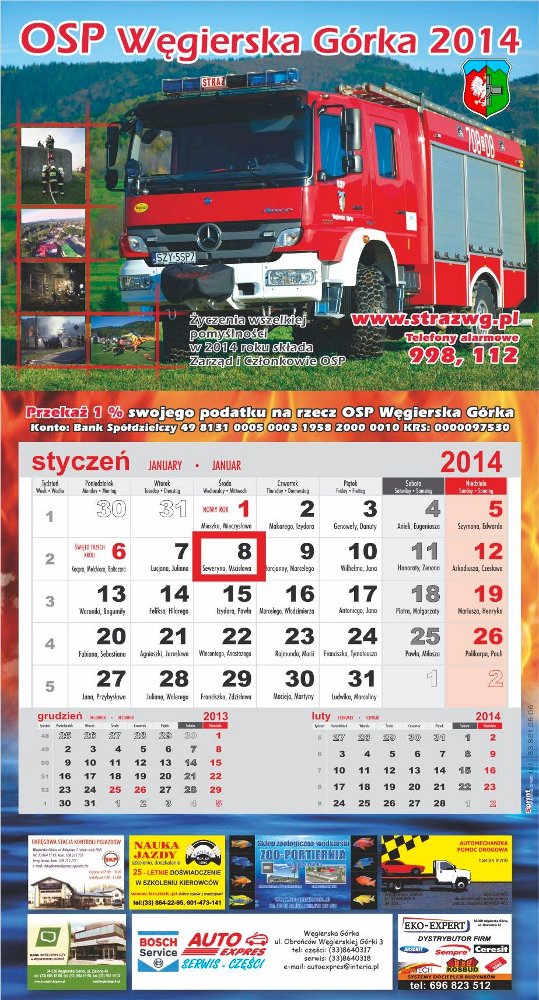G³ówka kalendarza prezentuje samochód bojowy do dzia³añ ratowniczo-ga¶niczych, który otrzymali¶my koñcem 2012r. Pojawi³y siê równie¿ ma³e fotografie z akcji ratowniczo-ga¶niczych, æwiczeñ oraz zdjêcie remizy z lotu ptaka. Na kalendarzu znajdziemy równie¿ informacje jak wspomóc nasza jednostkê poprzez przekazanie 1 % swojego podatku na rzecz OSP Wêgierska Górka. 1% czytaj wiêcej.